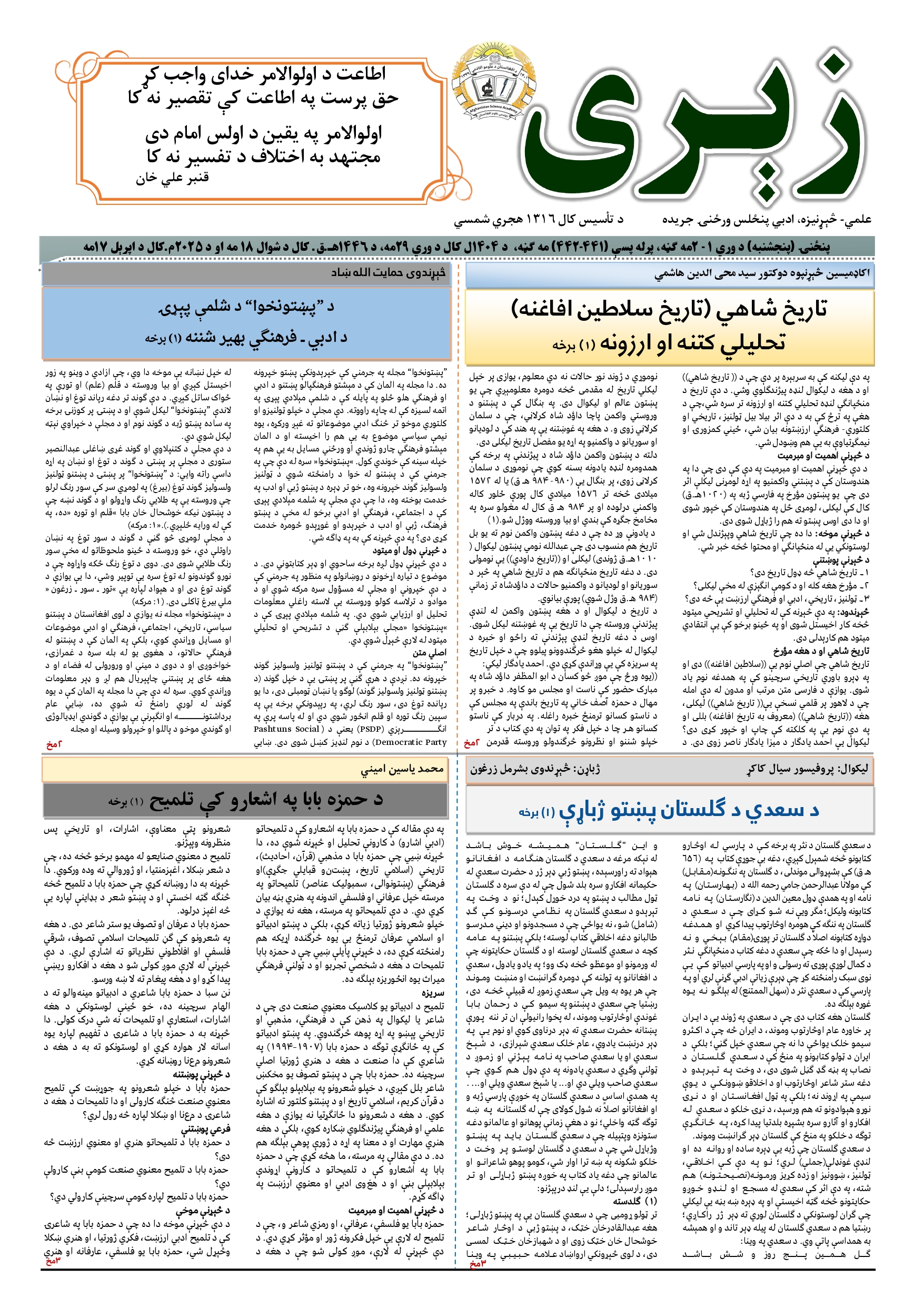 زیری جریده، ۴۴۱-۴۴۲ مه ګڼه، وری میاشت، ۱۴۰۴ل کال