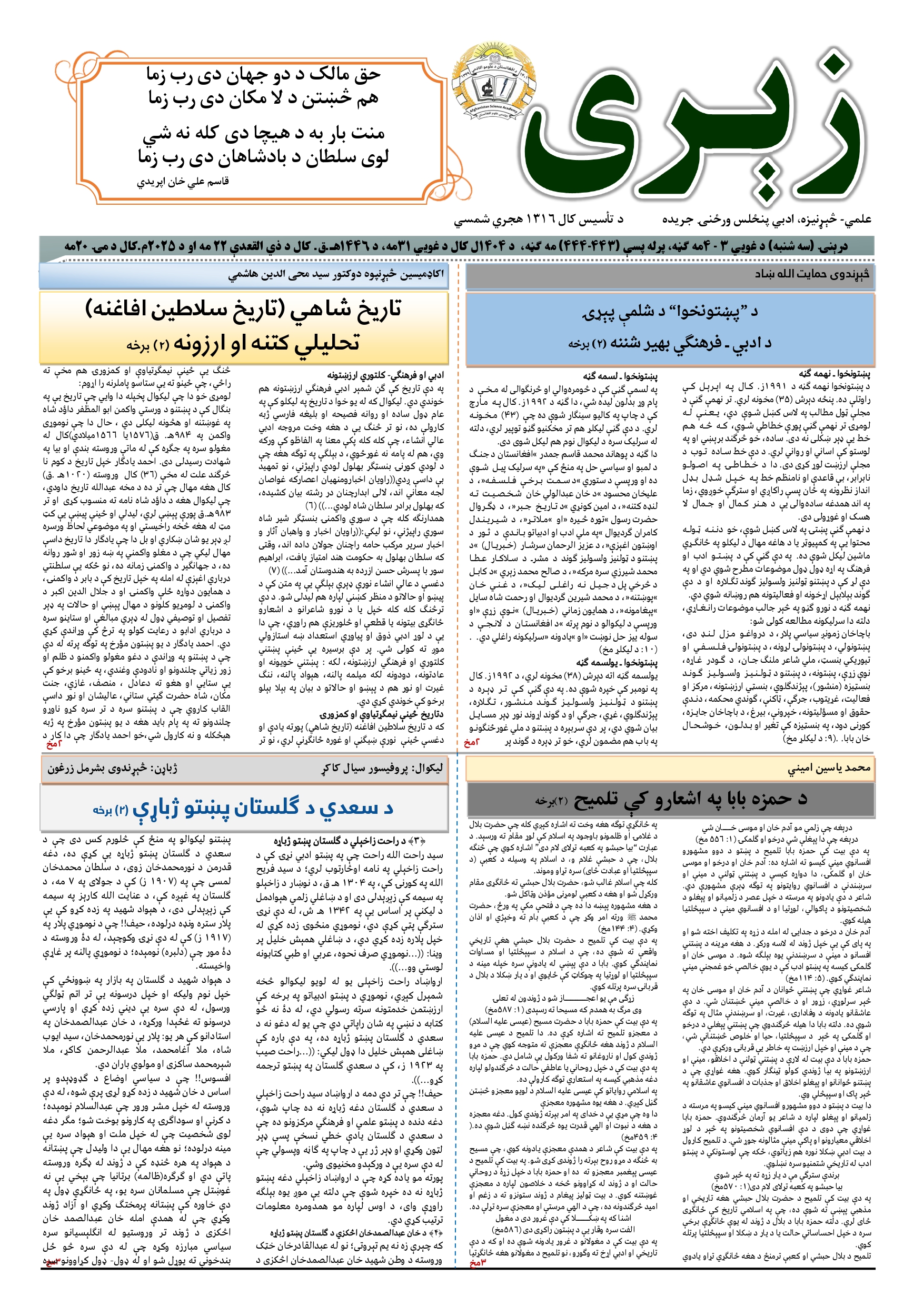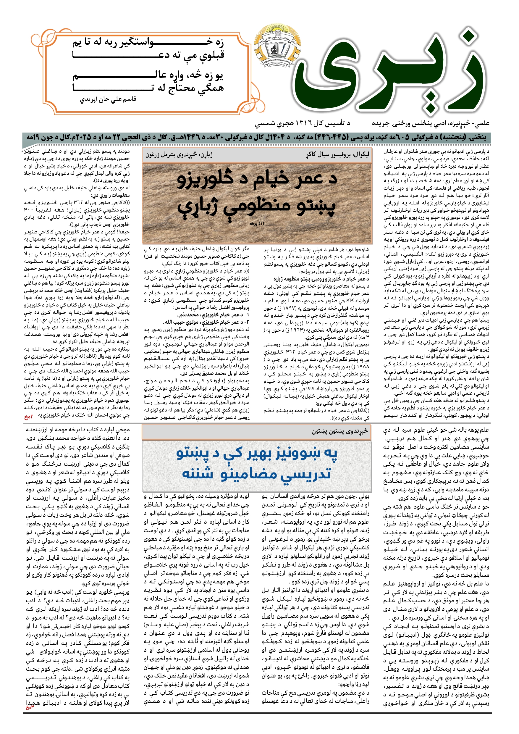 زیری جریده، ۴۴۵ - ۴۴۶ مه ګڼه، غبرګولی میاشت، ۱۴۰۴ل کال