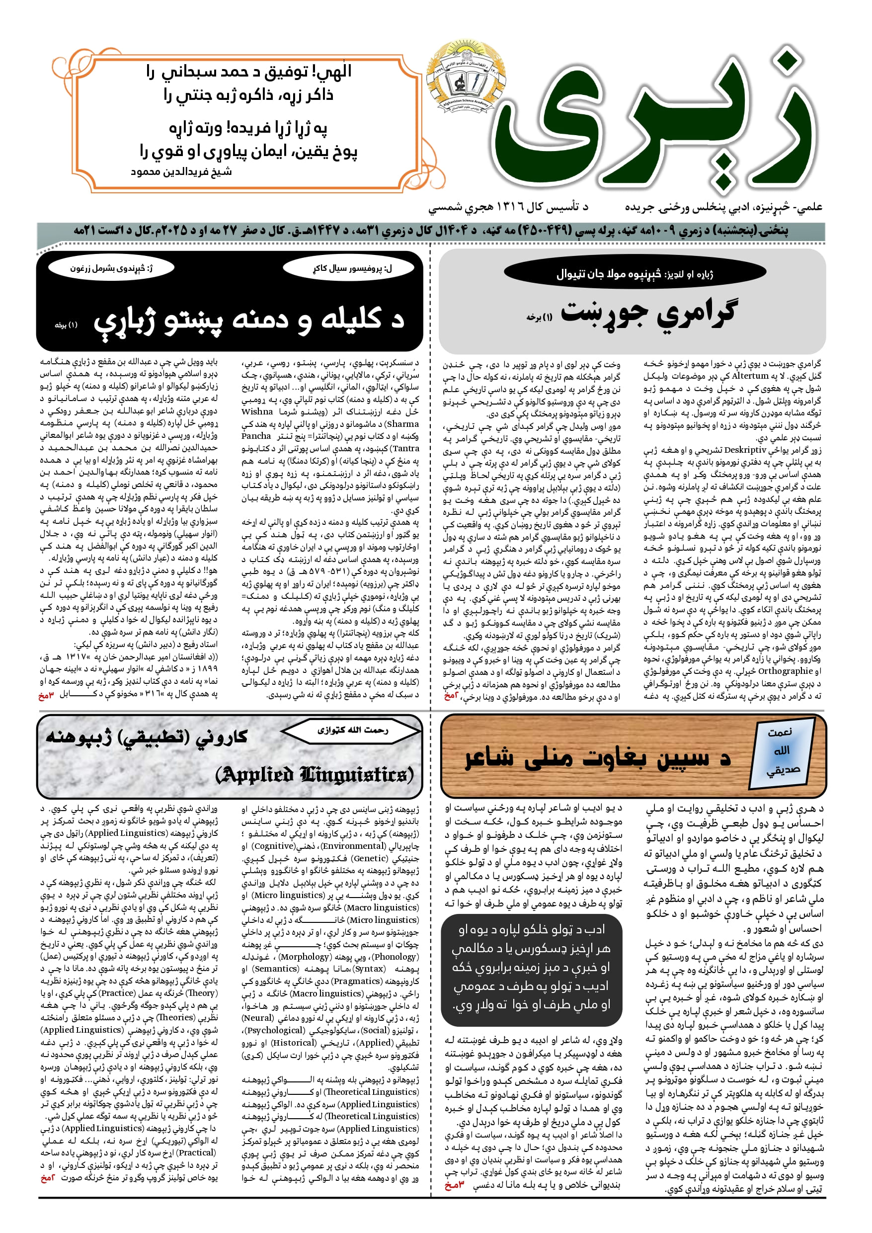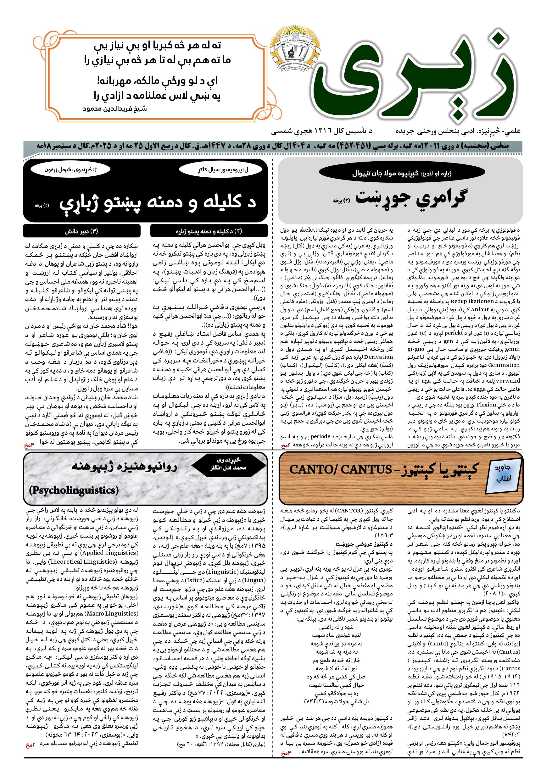 زیری جریده، ۴۵۱ - ۴۵۲مه ګڼه، وږي میاشت، ۱۴۰۴ل کال