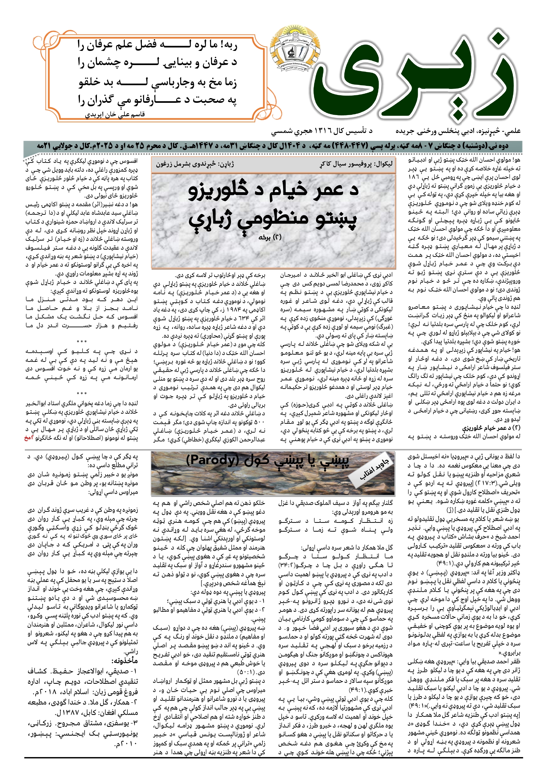 زیری جریده، ۴۴۷ - ۴۴۸مه ګڼه، چنګاښ میاشت، ۱۴۰۴ل کال